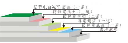 ①防水處理: 一樓地面需已做好防水處理; ②素地處理: 依素地狀況做好打磨、修補、除塵; ③防靜電底漆:采用滲透性及附著力特強防靜電環(huán)氧底漆滾涂一道,增強表面附著 力; ④防靜電中涂:防靜電中涂將環(huán)氧樹脂加入適量的石英砂,用鏝刀將其均勻涂布一至 二道; ⑤銅箔鋪設: 導電銅箔采用井型鋪設,有效排除累積之靜電,并做接地處理; ⑥防靜電批土:防靜電批土依實際需要施工數(shù)道,要求達到平整無孔洞,無批刀印及 砂磨印為準; ⑦防靜電面漆:防靜電面漆滾涂二道,其體積/表面電阻平均系數(shù)值1X10^6~1X10^9Ω,完工后整體地面光亮潔凈,顏色均一,無空鼓; ⑧施工完成: 24小時后方可上人,72小時后方可重壓。(25℃為準,低溫時開放 時間需適度延長)